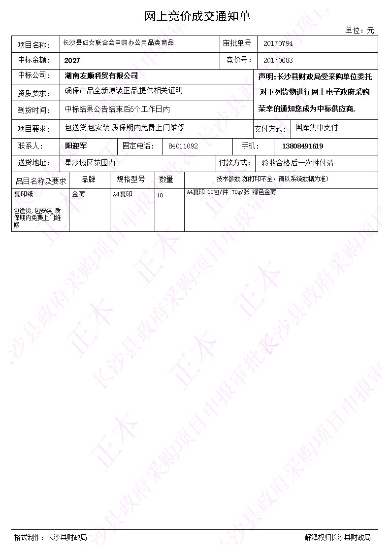 长沙县妇女联合会申购复印纸网上竞价成交结果公告