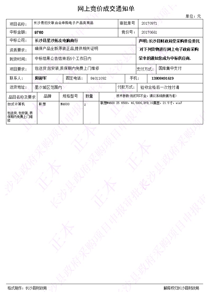 长沙县妇女联合会申购台式计算机网上竞价成交结果公告