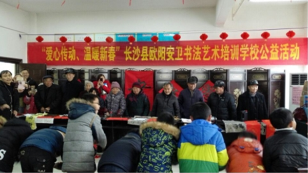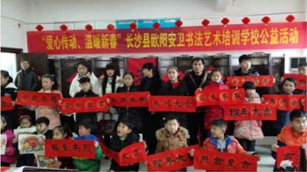 “辞了灶,年来到,妹子要花,伢子要炮,婆婆要新衣,爹爹要新帽”,在欢快的童谣声中,“年兽”踏着积雪、迈着轻快的脚步声悄悄来到了我们身边。长沙县欧阳安卫书法艺术培训学校的一群可爱的孩子们,带着一颗颗滚烫的爱心、捧着一幅幅稚嫩的书画作品,来到了黄花镇敬老院,开展了一场“爱心传动、温暖新春”公益活动,和百余名老人一起欢度小年。