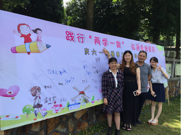 柳紫晨小朋友作了坚强有力表态发言。最后,活动所有参与人员在签名墙前留影,记录下这美好的一刻。亲子系列活动在欢乐的雄黄画额中开场,接下来的土车接力赛、浑水抓鱼、