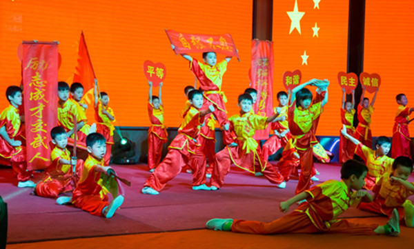 整场晚会由《忆往昔·峥嵘岁月》、《看今朝·辉煌巨变》、《勤学做·兴党爱党》和《展未来·蓄势腾飞》四个篇章组成,晚会在豪迈的大合唱《在灿烂的阳光下》中拉开了序幕。镇机关女干部表演的小型花鼓戏《“两学一做”谱新篇》、大兴文武学校少年儿童表演的武术《中华少年》以及高岸妇女主任王芳带领高岸两个年轻村干部自编自演小品《拆迁趣事》给大家留下了深刻的映像本土演员们饱含深情、极富感染力的表演让整场演出高潮迭起,精彩纷呈,充分表达了牢记历史、不忘过去、珍爱和平、开创未来的坚定意志,有效激发了妇女同胞创先争优、干事创业,奋发有为的热忱和戮力前行争做新时期合格党员的决心。