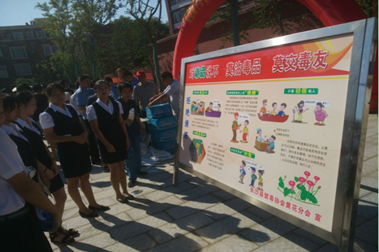 月23日,黄花镇妇联主席组织镇、村妇女干部40余人参加了在湖南都市职业学院前坪集中开展的禁毒宣传及法制、反邪教等宣传活动,将“增强全民意识,共建净美黄花”的理念传播到现场群众、园区企业、网吧、宾馆、娱乐场所和广大青年学生心中。另外,在全镇中小学范围内开展了以“拒绝毒品,真爱生命”为主题的专题黑板报、绘画书法评比,娱乐场所从业人员禁毒知识专项培训,禁毒宣传进企业、社区、学校、网吧、娱乐场所等活动。向居民朋友发放《平安黄花宣传手册》、《法律明白人》、《人民读本》、《家庭禁毒手册》、《黄花平安家庭倡议书》等各种法制宣传资料,活动共发放禁毒宣传单、禁毒倡议书2000余份,禁毒宣传纸杯2万个,反邪宣传单2000余份,信访宣传手册3000余份,《公民法律常识》读本及平安家庭创建宣传手册2万余本,悬挂宣传横幅30余条。使居民增强学法、遵法、守法、用法意识,营造良好氛围,提升了居民的法治意识。