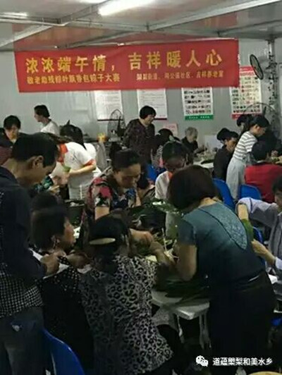 一大早,工作人员就准备好了糯米、粽叶、肉泥和红枣等材料,并邀请了社区里心灵手巧的吴玉香阿姨来教导老人们如何包粽子,近50名老年人在活动现场参加包粽子比赛。在大家的巧手下,不一会儿就制作了500余个粽子。比赛过后,大家带着包好的粽子,挨家挨户地送到孤寡老人和残疾人家中,提前为他们送上节日的祝福。