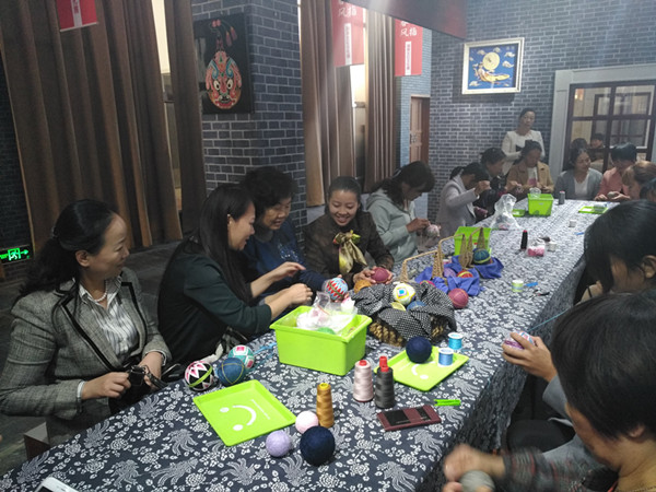 在湖湘女红文化展洽中心与学员们一起学习绣制手鞠球