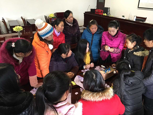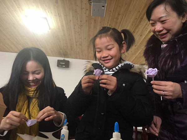从广州嫁到葛家山村的35岁的纪晓霞带着8岁的小女儿一起参加了本次培训,母女俩学得非常认真,纪晓霞告诉我们,小女儿不但要自己学会,还要教给在深圳的姐姐,所以回家还要做好笔记,等姐姐春节回来时才不会忘记。阳智主席和她们进行了亲切交谈,询问小女孩能否将自己亲手制作的纸艺玫瑰送给班上的每一位同学并告诉他们制作,小女孩腼腆而爽快地回答“能”!